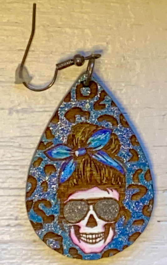 Blue Leopard Smiling Skull Woodl Earrings!