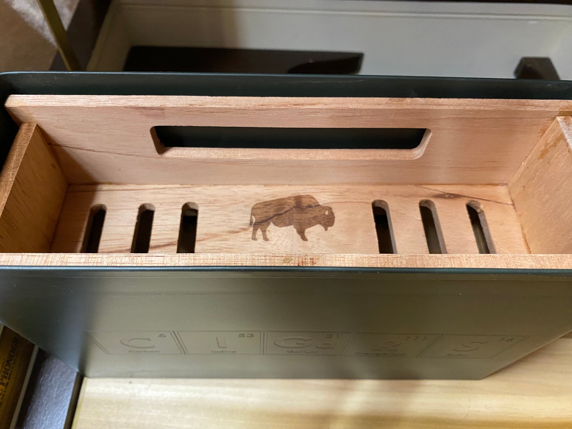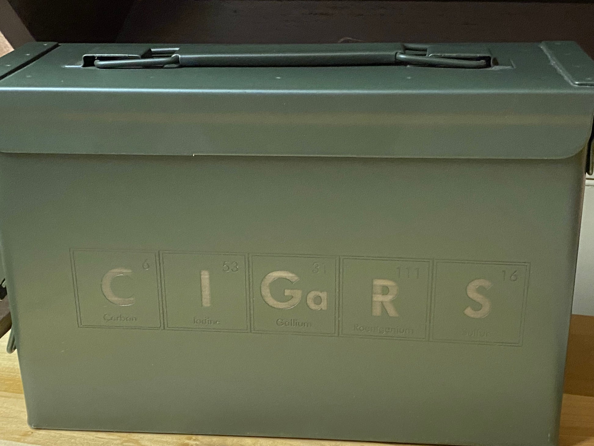 Not your granddad’s cigar box. Our 30-cal green metal can style humidor brings a little grit to your smoke game. Rugged on the outside, refined on the inside — Spanish cedar lining keeps your sticks fresh, while the built-in hygrometer makes sure the conditions are just right. Whether you’re stashing it in the truck, the shop, or on the porch with a pour, this humidor is equal parts tough and timeless.