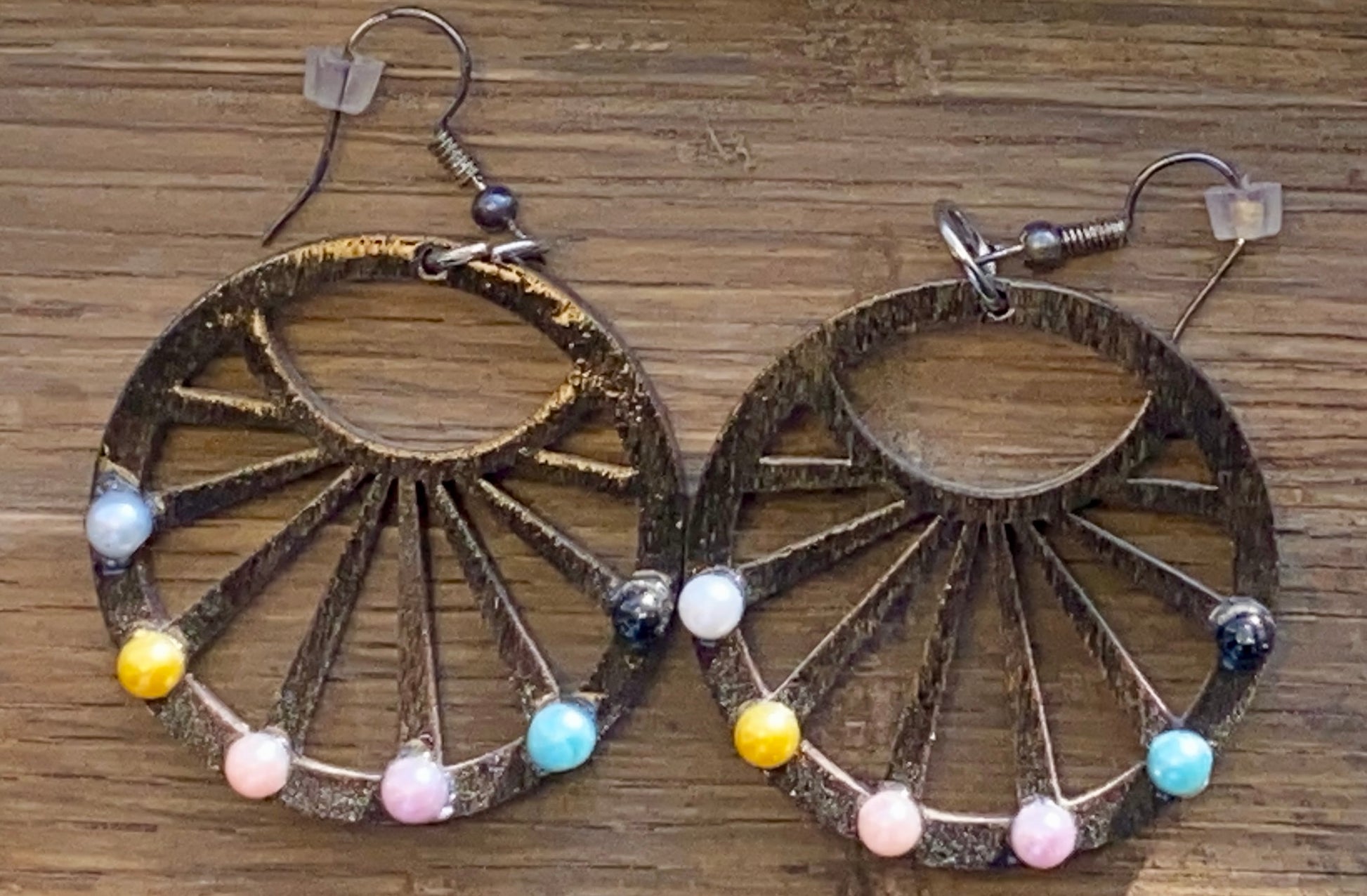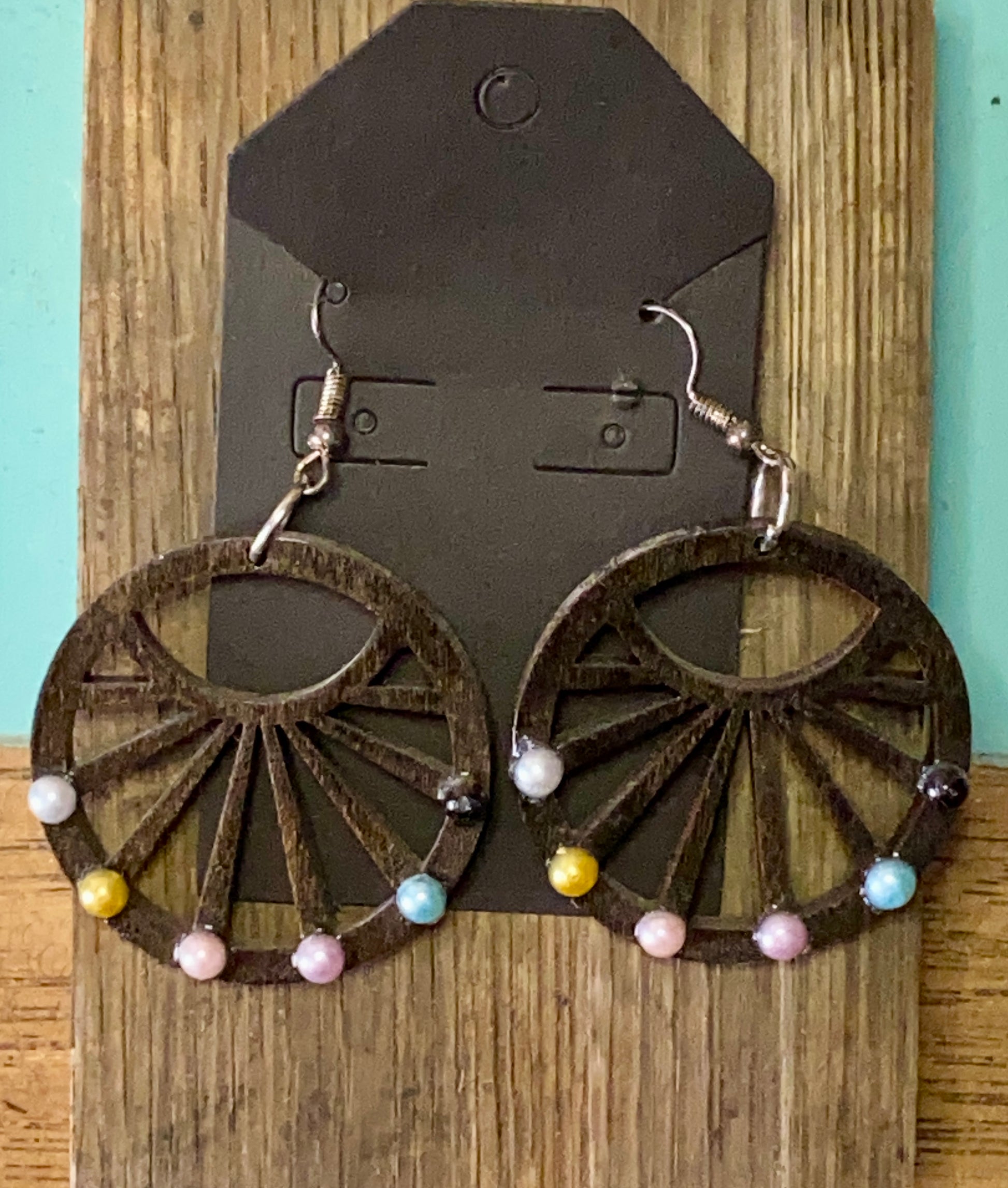 Get your ears rolling with the wagon wheel inspired earrings! Made from wood, these earrings bring a touch of prairie rebellion style to any outfit. A perfect quirky and playful accessory.
